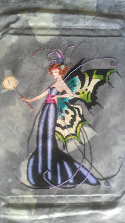 This will be a mermaid bellpull for in the bathroom, the two mermaids are stitched using the same techniques just different colors for the hair. Both tails are stitched with Pailettes in a peacock color with the torso and face outlined in DMC 310 (black)